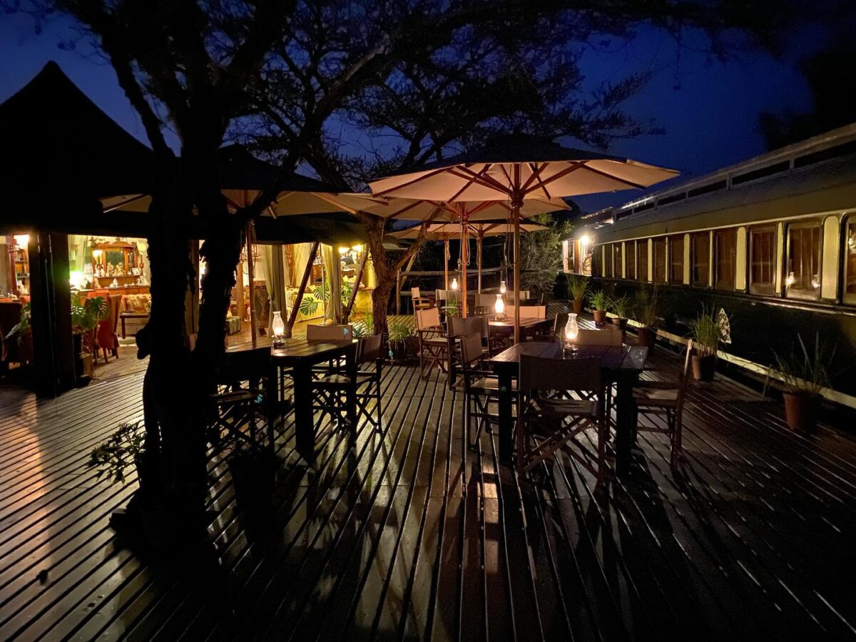 The lodge’s standout feature is its extraordinary dining experience aboard a meticulously restored 100-year-old Rovos Rail luxury train carriage.